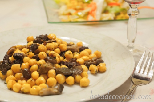 Finalmente añadimos los garbanzos cocidos (estos los habremos cocido anteriormente o bien los compramos cocidos) y vamos mezclando todo y esperamos unos minutos para que quede todo bien caliente.