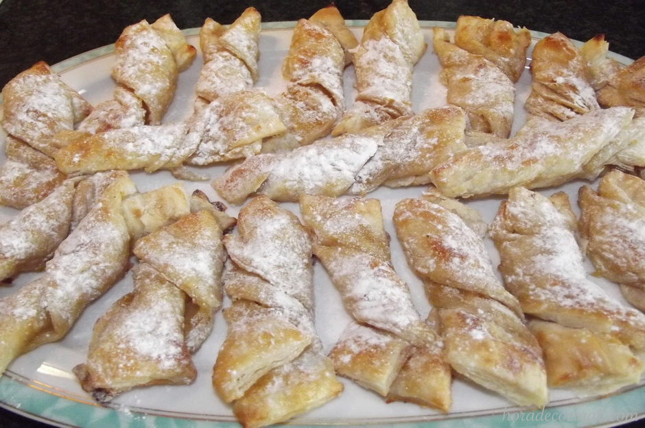 Cortar en tiras de unos 2 cm de ancho con un cuchillo muy afilado o bien un cortapizzas que hará que consigamos un corte recto y rápido. De los bordes nos sobrará masa para que quede todo a la misma medida y la desecharemos. A las tiras les daremos una vuelta por en medio y las colocamos en la bandeja de horno que habremos cubierto con papel plata y espolvoreado con azúcar glas.